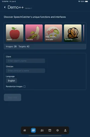 Complete the session fields below the test information:Setting Required? Description Client Yes Select from your list of registered clients. Clinician Yes Enter the name of the person administering the test. Language No Select if multiple languages are available. Dialect No Select if multiple dialects are available. Randomize No Show test images in random order. -